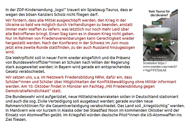 Im Juli hat der BSV in seinem Sommermailing unter dem Titel „9o Sekunden bis Mitternacht“ verschiedene Entwicklungen im Zusammenhang mit dem Bestreben von Bundesregierung und den größten Oppositionsparteien beschrieben, Deutschland „kriegstüchtig zu machen“ und was aus unserer Arbeit damit in Zusammenhang steht.