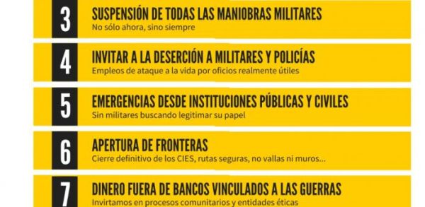 „Wie wir uns in Zeiten von Corona vom Virus des Militarismus desinfizieren: 1. Wascht den Militärhaushalt 2. Spanisches Militär, bleibt zuhause 3. Aussetzen aller Militärmanöver 4. Polizei und Militär zur Desertion aufrufen 5. Notfälle werden von öffentlichen und zivilen Institutionen gehandhabt 6. Öffnen der Grenzen 7. Geld aus den Banken nehmen, die Kriege finanzieren 8. Konversion 9. Waffenhandel stoppen Wachsen durch Zivilen Ungehorsam, gegenseitige Hilfe, Dialog, soziale Gerechtigkeit, Neuaufteilung der Vermögen…“