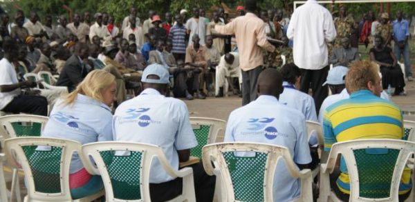 Mitarbeiter*innen von NP beobachten eine Zeremonie zum Schluss eines regionalen Friedensabkommens im Südsudan, das dank ihrer Vermittlung zustandegekommen war.