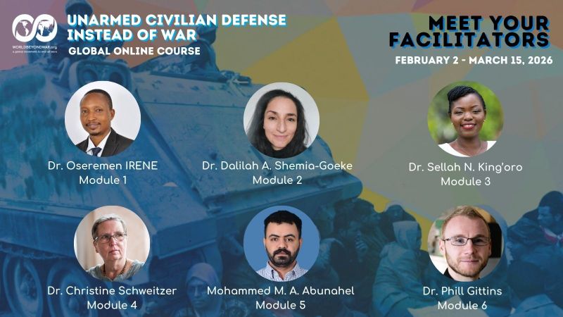 Der bevorstehende englischsprachige Online-Kurs von World BEYOND War bietet eine praktische Gelegenheit, diese Alternativen anhand von Fallbeispielen aus der Praxis, Strategien und einem regionenübergreifenden Dialog eingehend zu untersuchen. Er findet nun schon zum dritten Mal statt, da es jedes Jahr seit 2024 eine starke Nachfrage gibt (über 100 Teilnehmende pro Runde).
