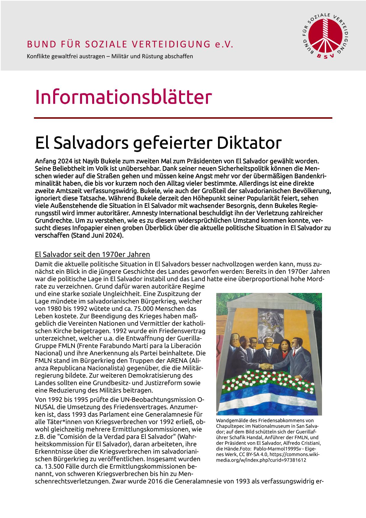 Das Infoblatt zeichnet die Geschichte El Salvadors bis zum Sommer 2024 nach.